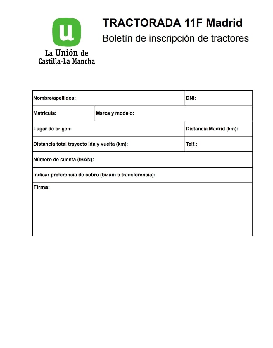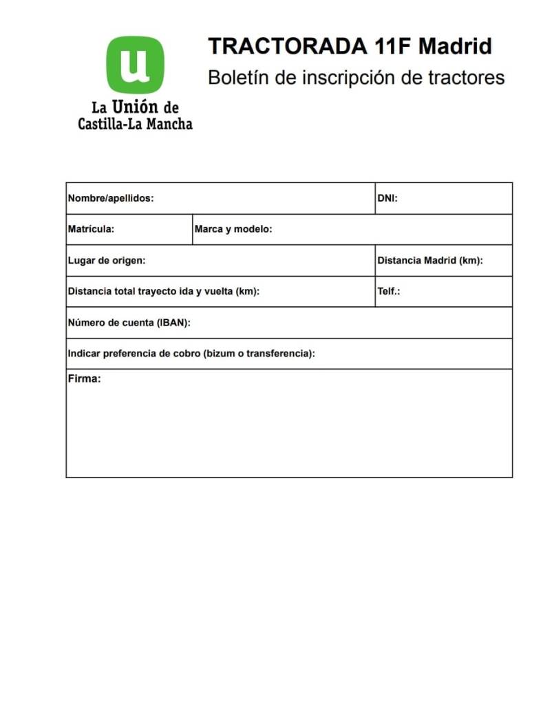 La Unión de Castilla-La Mancha, conociendo el estado actual del sector, ha decidido ayudar, en la medida de sus posibilidades, a los agricultores que decidan desplazarse con su tractor a Madrid para participar en la manifestación del próximo 11 de febrero.