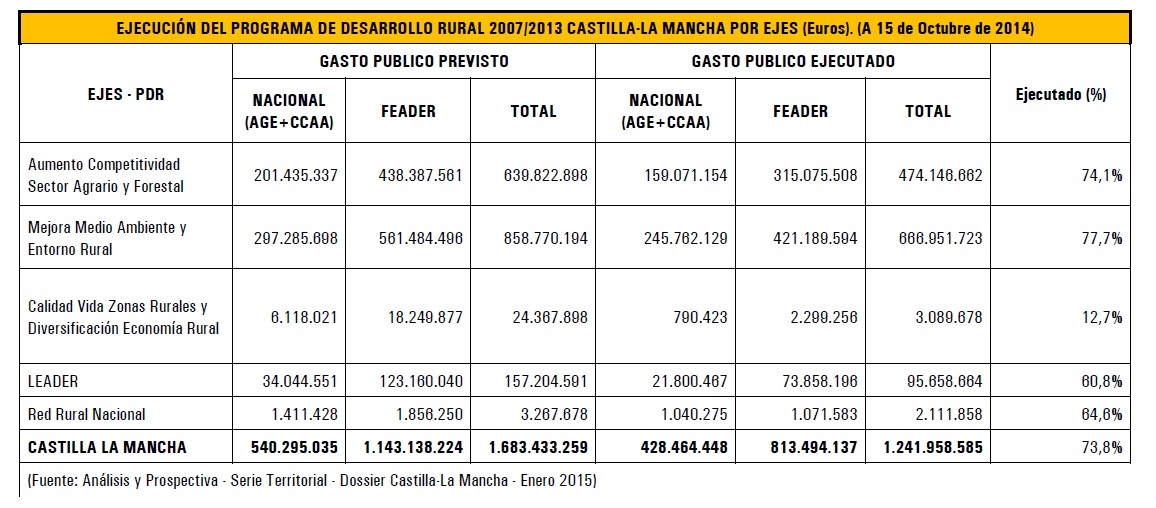 El ejercicio 2015 es el último año en el que se pueden imputar gastos al PDR 2007/2013 y el grado de ejecución que presenta Castilla-La Mancha es del 73,8 %. La Unión de Uniones de Castilla-La Mancha considera que este porcentaje podría resultar preocupante si desde la administración autonómica no se realiza un esfuerzo de activar las medidas de desarrollo rural del plan (incorporación de jóvenes, planes de mejora, regadíos, agroambientales, agricultura ecológica, indemnización compensatoria de zonas desfavorecidas) y no se responde suficientemente, tanto desde las arcas de la Consejería de Agricultura como desde el Ministerio, para hacer frente a la participación estatal en el plan.