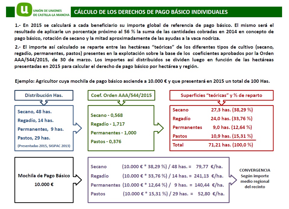 A partir de estos coeficientes y conociendo el importe total de la mochila que un agricultor trae de la PAC de 2014, puede hacerse una estimación del valor de los derechos de pago básico por hectárea para cada una de las superficies que el agricultor tenga en las diferentes regiones.