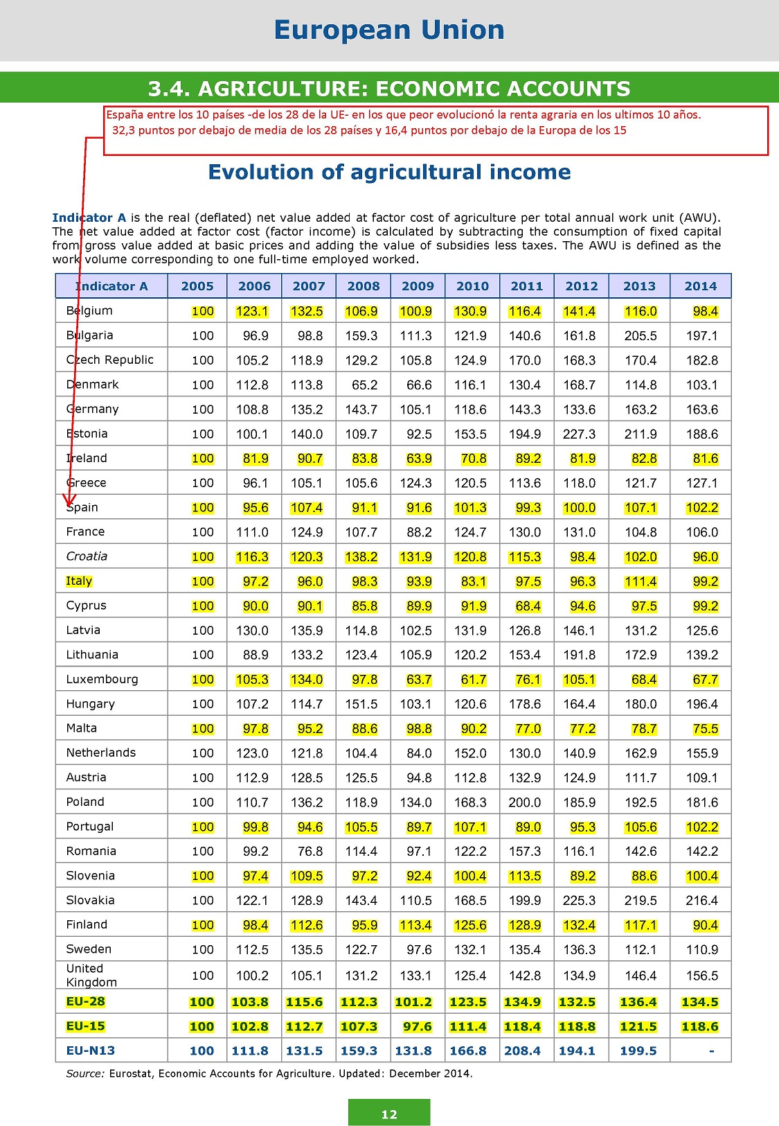 También les han trasladado su preocupación por la incidencia directa que la pérdida de ayudas tiene sobre las rentas agrarias, que dependen de las mismas en un 28,8 %. En este sentido, y según los datos de la propia UE a diciembre de 2014, España está entre los 10 países (de los 28 de la UE) en los que peor ha evolucionado la renta agraria en los últimos 10 años; situándose 32,3 puntos por debajo de la media de la Europa de los 28 y 16,4 puntos por debajo de la Europa de los 15. (Adjuntamos cuadro con los datos).