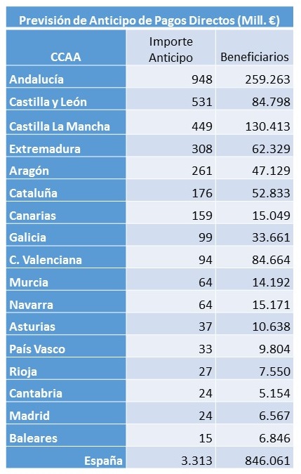 Considerando sólo los pagos directos, el volumen total anticipado podría alcanzar la cifra de 3.288 millones de euros para el conjunto del Estado, y suponer un alivio económico para alrededor de unos 840.000 beneficiarios de la PAC.