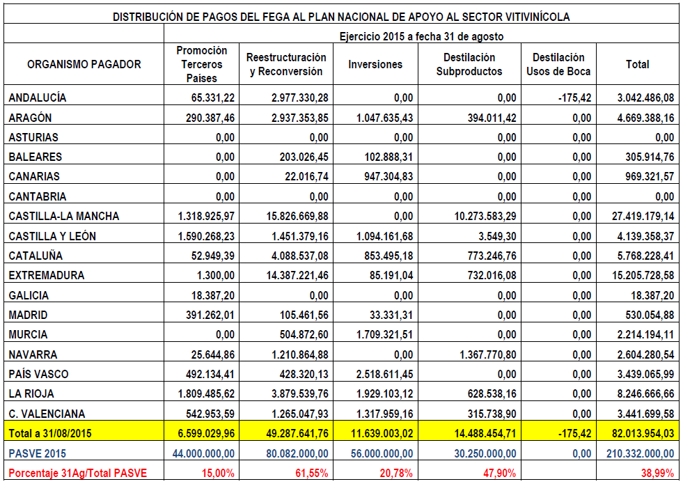 El FEGA, en su informe mensual correspondiente al 31 de agosto pasado, informa que ha efectuado pagos a las Comunidades Autónomas por un total de 82 millones de euros imputables al Plan de Apoyo al Sector Vitivinícola (PASVE), lo que representa apenas un 39% de los 210,3 millones de euros que constituye el conjunto dedicho Plan. Esta situación pone en riesgo la capacidad del Estado español para agotar en el presente ejercicio dichos fondos, que serían financiados al 100 % por la Unión Europea a través del FEAGA (Fondo Europeo Agrícola de Garantía); ya que todas las actuaciones que pueden imputarse en 2015 tienen que haberse realizado antes de finalizar julio pasado y estar certificadas y abonadas antes del 15 de octubre.