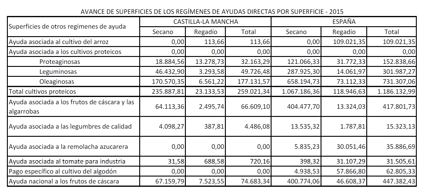 Por otro lado, el número de hectáreas susceptibles de ser elegibles a efectos de pago básico han sido 4.267.102; de las cuales una mayor proporción la representan los cereales (1,452.727 hectáreas); seguido de los barbechos (764.485 hectáreas); los pastos permanentes (687.280 hectáreas); el viñedo (397.684 hectáreas) y el Olivar (315.781 hectáreas).
