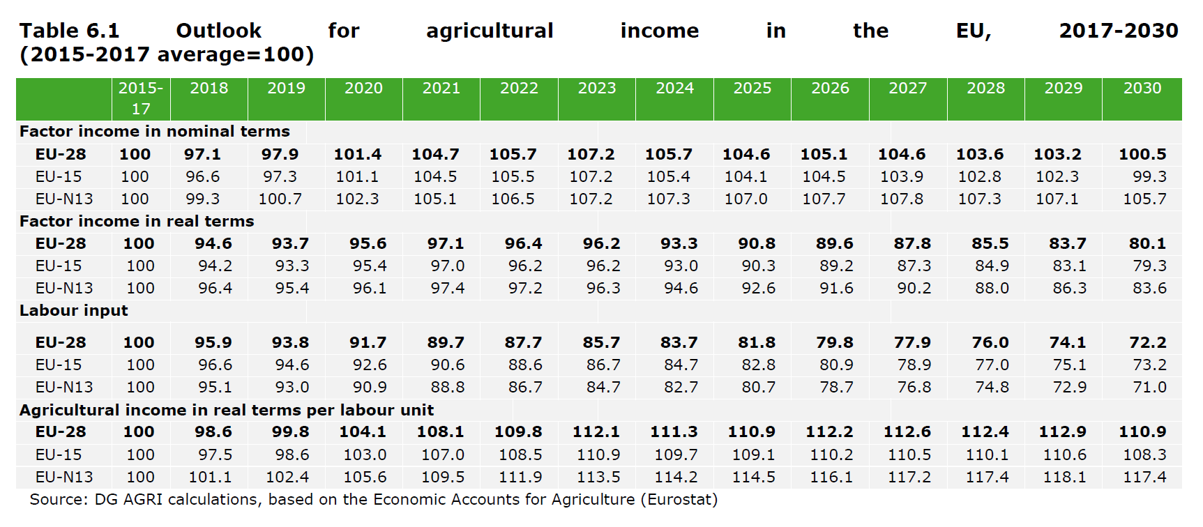 Unión de Uniones señala que el estudio prevé una disminución de la renta agraria de la UE en términos reales en el marco de la UE-15, países entre los que se encuentra España, mientras que la producción agrícola se incrementaría al 2030 a una media del 1,8 % anual, igual que los costes de producción, al 2,5 %, sobre todo por el encarecimiento de los precios de la energía. Ello conduce a una práctica estabilización de la renta agraria total de la UE-15 en términos corrientes, que se traduce en una caída en términos reales del 20,7 %.