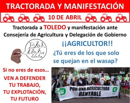 2 Respuestas a “10 de Abril. Tractorada a Toledo y Manifestación ante la Consejería de Agricultura y Delegación del Gobierno”