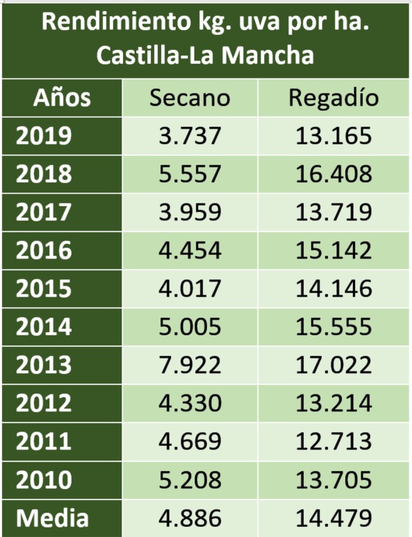 Si se obtienen de las estadísticas oficiales del Ministerio los datos de rendimientos de los últimos años en Castilla-La Mancha (entre 2010 y 2019), la media de rendimiento de las viñas de secano no ha llegado a 4.900 kg./Ha. de uva; mientras que en las de regadío, ha estado por debajo de los 14.500 kg./Ha. Esto quiere decir que el viñedo de secano, que sigue siendo el 65% de la superficie de viñedo de la región, en la práctica va a quedar fuera de la norma, porque muy difícilmente va a haber parcelas que alcancen los topes de establecidos.