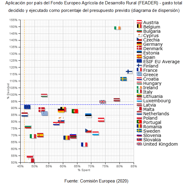 Con el quinto presupuesto a nivel UE, España se sitúa, con un 51% de realización, como uno de los Estados con menor nivel de ejecución y planificación de fondos FEADER