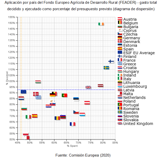 Con el quinto presupuesto a nivel UE, España se sitúa, con un 51% de realización, como uno de los Estados con menor nivel de ejecución y planificación de fondos FEADER