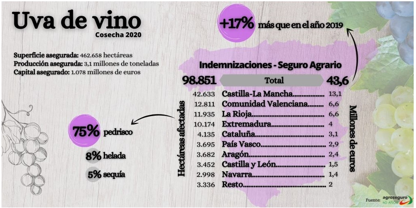 Según informa Agroseguro y recoge Unión de Uniones, las indemnizaciones a productores de uva de vino asegurados se elevan a 43,6 millones de euros por los siniestros producidos en 2020 (un 17% más que en 2019) sobre un total de 98.851 hectáreas afectadas. A estas alturas debe estar pagado ya un 90% de ese total, es decir, unos 39,2 millones ya abonados, un 90% del total anual.