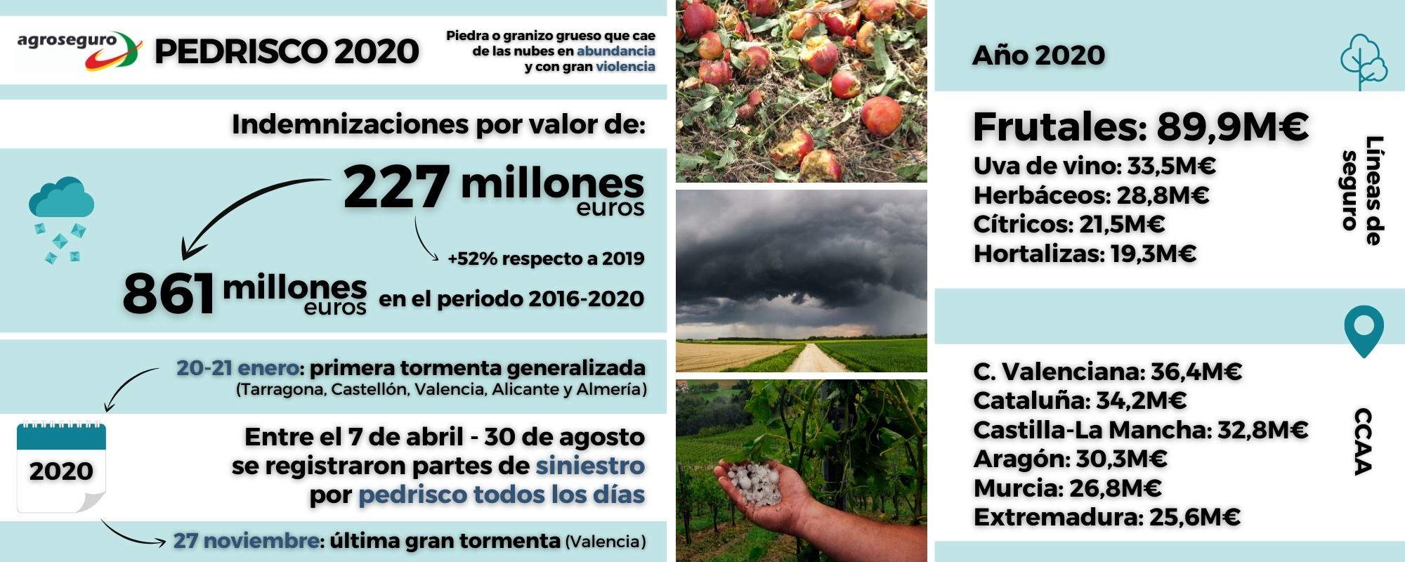 Unión de Uniones se hace eco de los datos de Agroseguro que reflejan que las tormentas de pedrisco fueron en 2020 el fenómeno meteorológico más dañino para el campo, con 227,4 millones en indemnizaciones. La fruta y la uva de vino fueron las producciones más afectadas. La Comunidad Valenciana, Cataluña y Castilla-La Mancha, las áreas con más daños