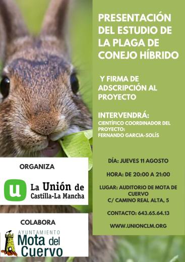 El próximo 11 de agosto, jueves, se organizará en Mota del Cuervo una jornada de puertas abiertas de presentación del estudio del conejo híbrido en Castilla-La Mancha, junto con la firma de adscripción de los distintos ayuntamientos, asociaciones de agricultores y cooperativas.