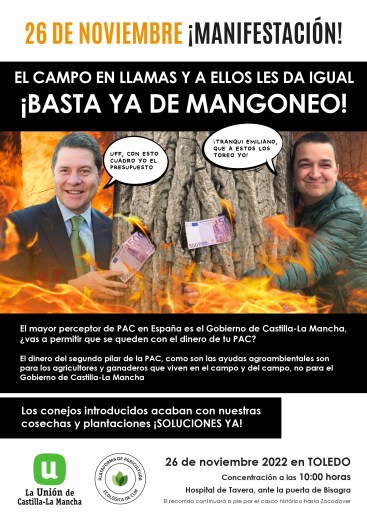 El Gobierno regional ha montado un sistema por el que mantiene un servicio público con el dinero que quita de la PAC. Si no quieres que esto siga ocurriendo y que el dinero que viene de Bruselas llega a tu bolsillo, que es donde debe estar, tienes la oportunidad de venir a reivindicarlo el día 26 de noviembre a Toledo.