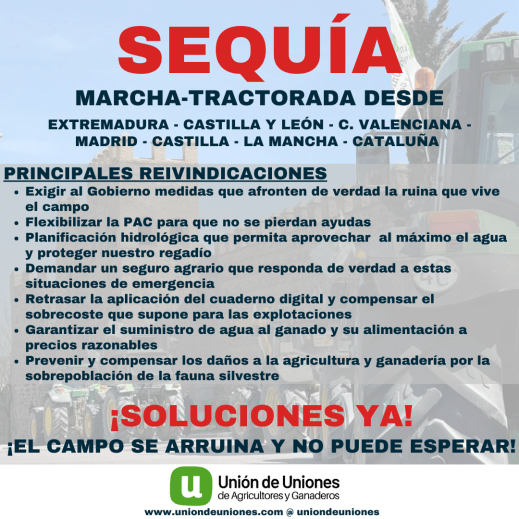 Se estima que se sumarán agricultores y ganaderos de todos las CC.AA así como alrededor de 150 tractores venidos desde Castilla – La Mancha, Castilla y León, Extremadura, Comunitat Valenciana y Cataluña. La Marcha de la Sequía, sale hoy, 3 de julio desde Girona y mañana 4 de julio lo hará desde Lleida, La Lastrilla en Segovia, Nambroca y Villacañas en Toledo, (y la Batea en Tarragona y el mismo 5 de julio desde Miajadas y Navalmoral de la Mata en Badajoz y Utiel en Valencia.