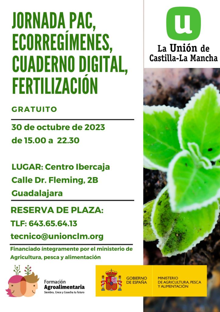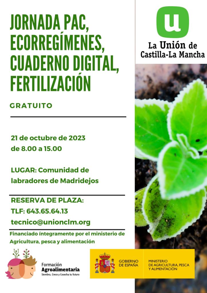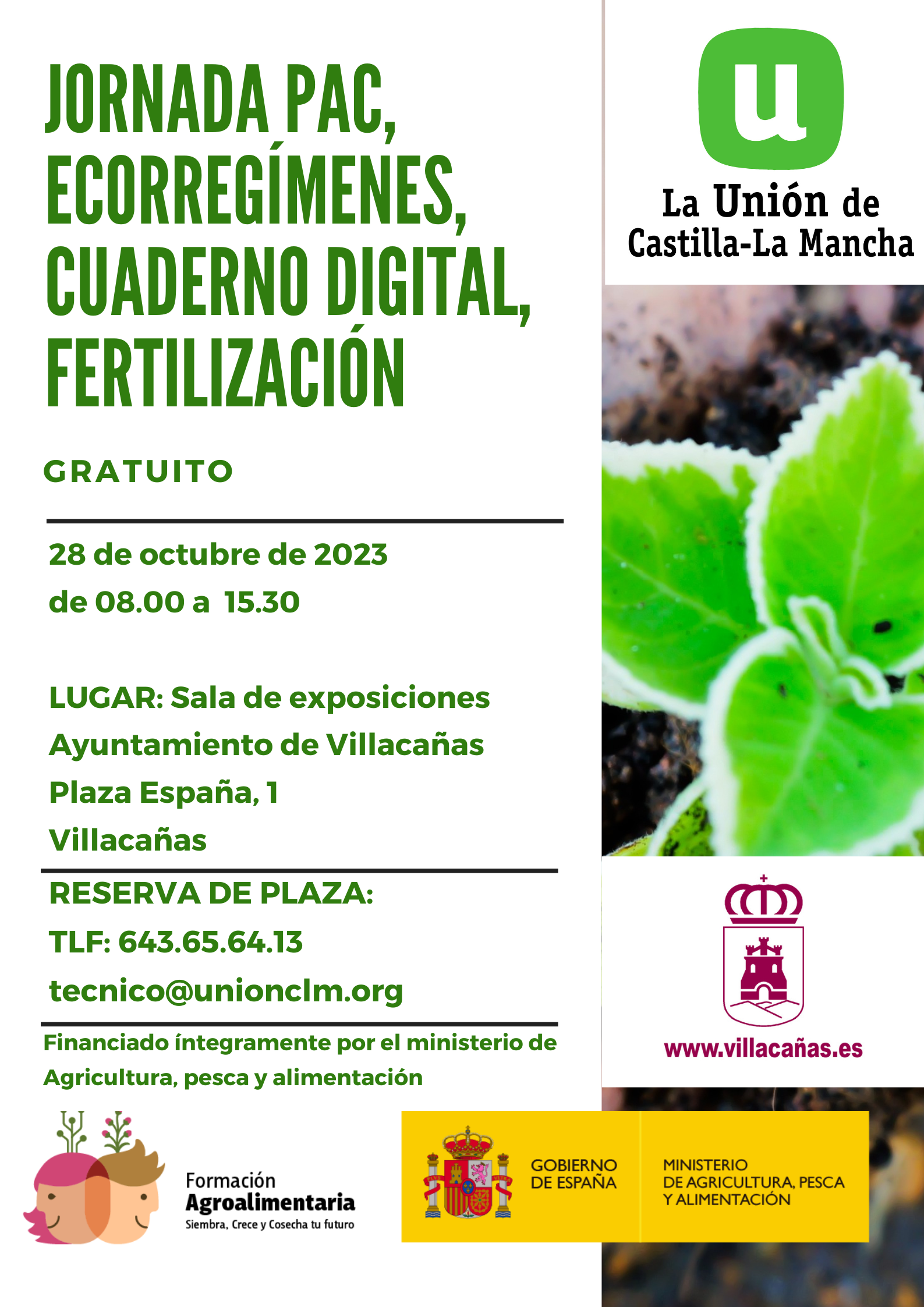 - JORNADAS sobre la nueva PAC: Ecorregímenes, cuaderno digital y fertilización alternativa. Campo de Criptana el 20 de octubre a las 15.00; Madridejos el 21 de octubre a las 8.00; Villacañas el 28 de octubre a las 8.00; Guadalajara el 30 de octubre a las 15.00.