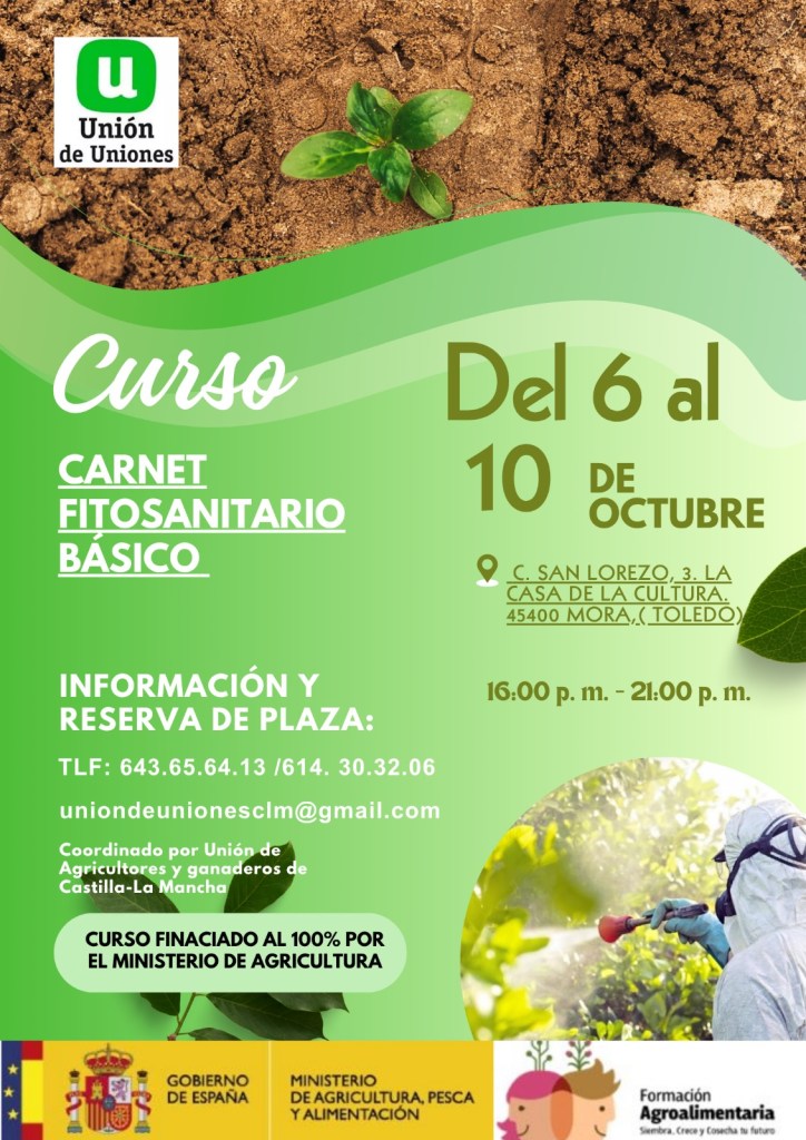 En nombre de la Unión de Castilla-La Mancha , te ofrecemos un curso oficial y 100% subvencionado por el Ministerio de Agricultura para la obtención del Carnet Fitosanitario Básico, obligatorio para el uso y manipulación de productos fitosanitarios.