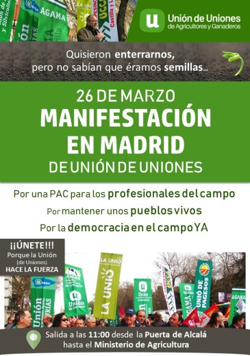 Unión de Uniones de Agricultores y Ganaderos, tras las movilizaciones llevadas a cabo en Extremadura, Valencia o Cataluña y las de esta semana y la próxima en Castilla y León, anuncia una gran manifestación para el próximo 26 de marzo en Madrid, para reclamar una redistribución de la PAC a favor de los profesionales del sector, una verdadera reforma de Ley de la Cadena Alimentaria que no se quede en papel mojado y la defensa de nuestro modelo productivo frente a la competencia desleal del exterior, entre otros aspectos.